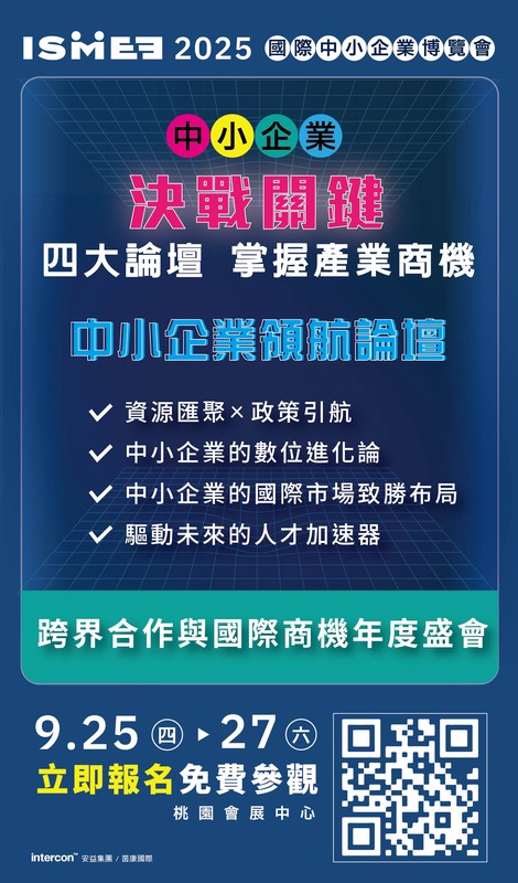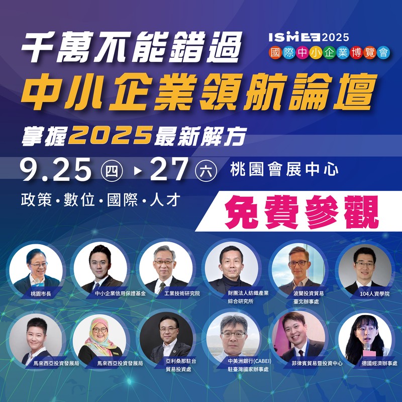 展會廣邀國內外企業與官方單位參與,結合政策、金融、科技、產業與國際市場,以展覽、論壇及媒合會協助中小企業在全球供應鏈重組浪潮下,找到成長新動能。桃園市長張善政亦將於9月26日下午出席「中小企業領航論壇」蒞臨會場,展現地方政府對中小企業轉型升級與國際化布局的高度支持。